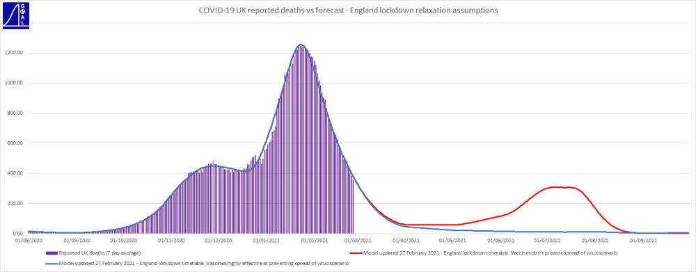 This is my forecast of UK COVID-19 deaths based on the England lockdown relaxation timetable. It’s more difficult to forecast now with impact of vaccines and new variants introducing more uncertainty.