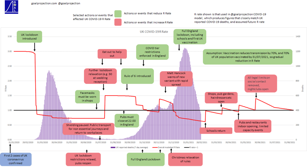 Below is an explanation of R rates I’ve used in my UK COVID-19 modelling. The lockdown relaxation timetable looks to be a pragmatic timeline that keeps R near 1 – as long as vaccines are effective at reducing transmission.